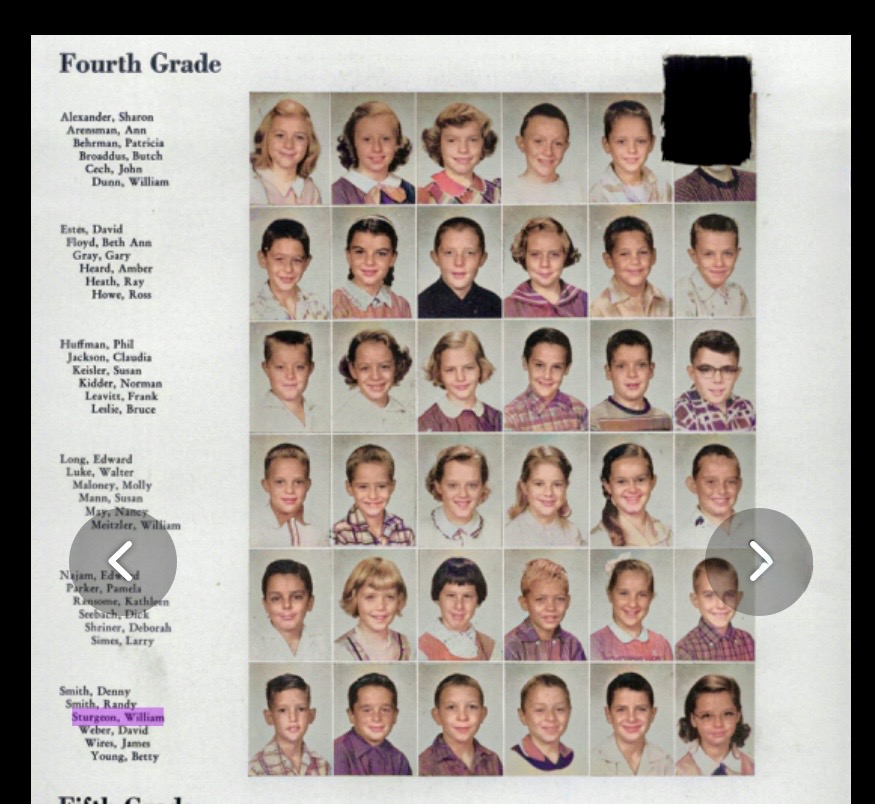| Bill sent a colorized scan of the 4th grade page of the 1957 Jordannus. Evidently, the owner of this copy was not fond of Will Dunn. Actually, it was the picture of 5th grader Gail Evans, on the other side of the page, that was cut out. |